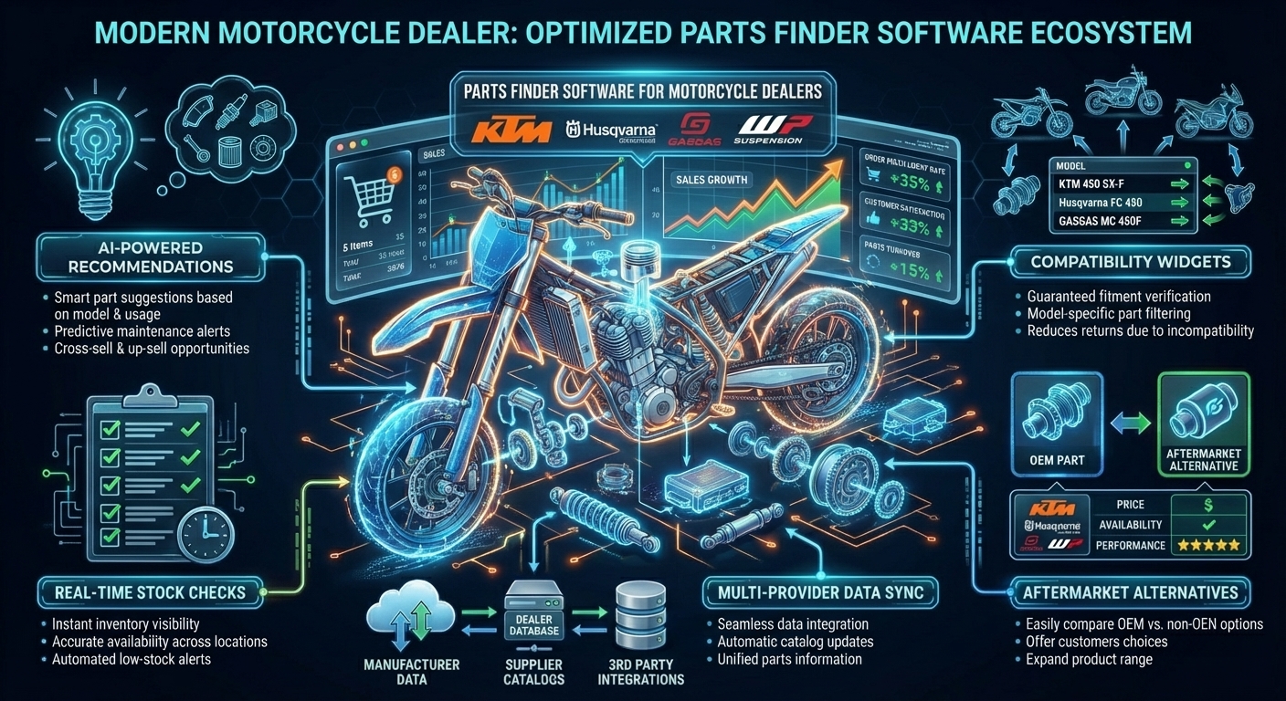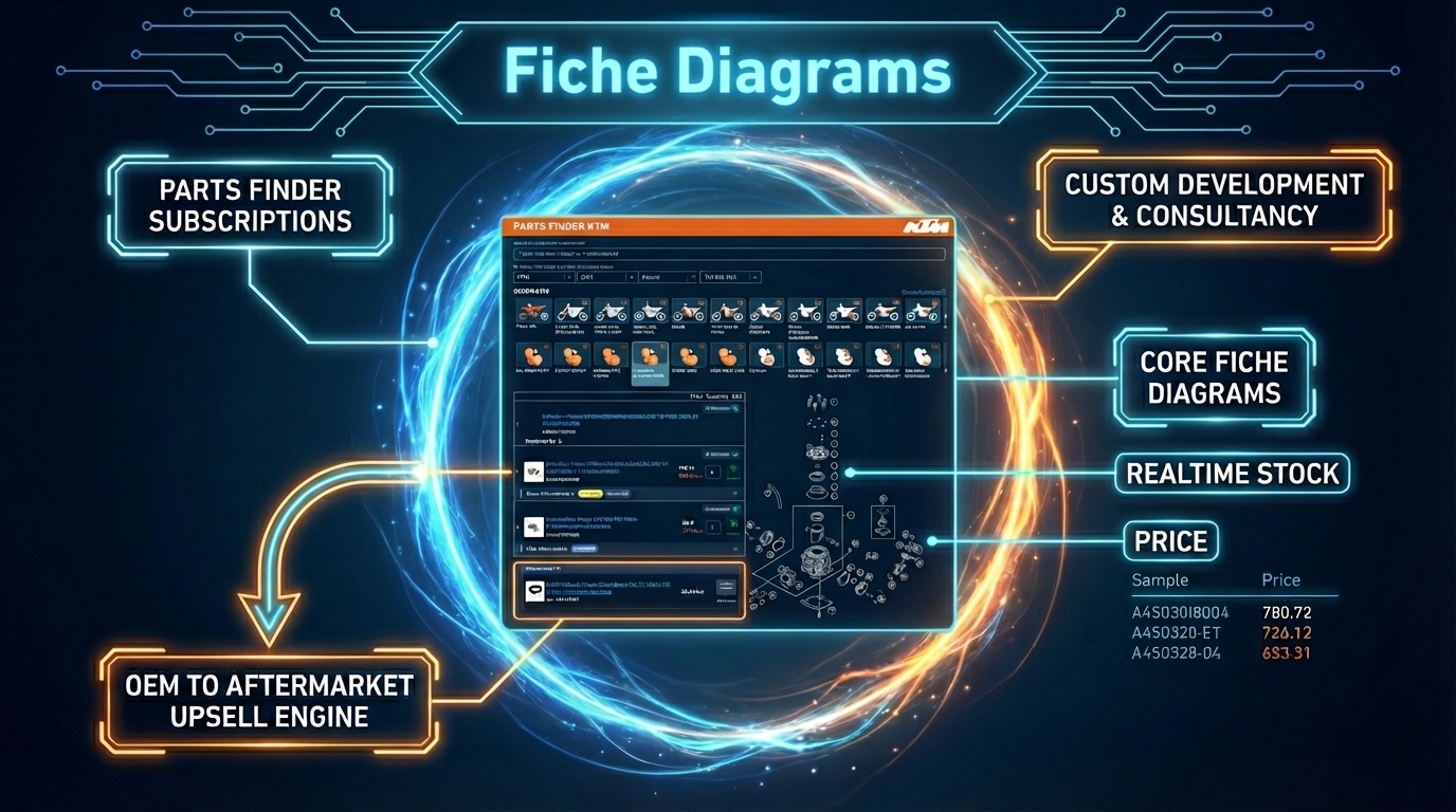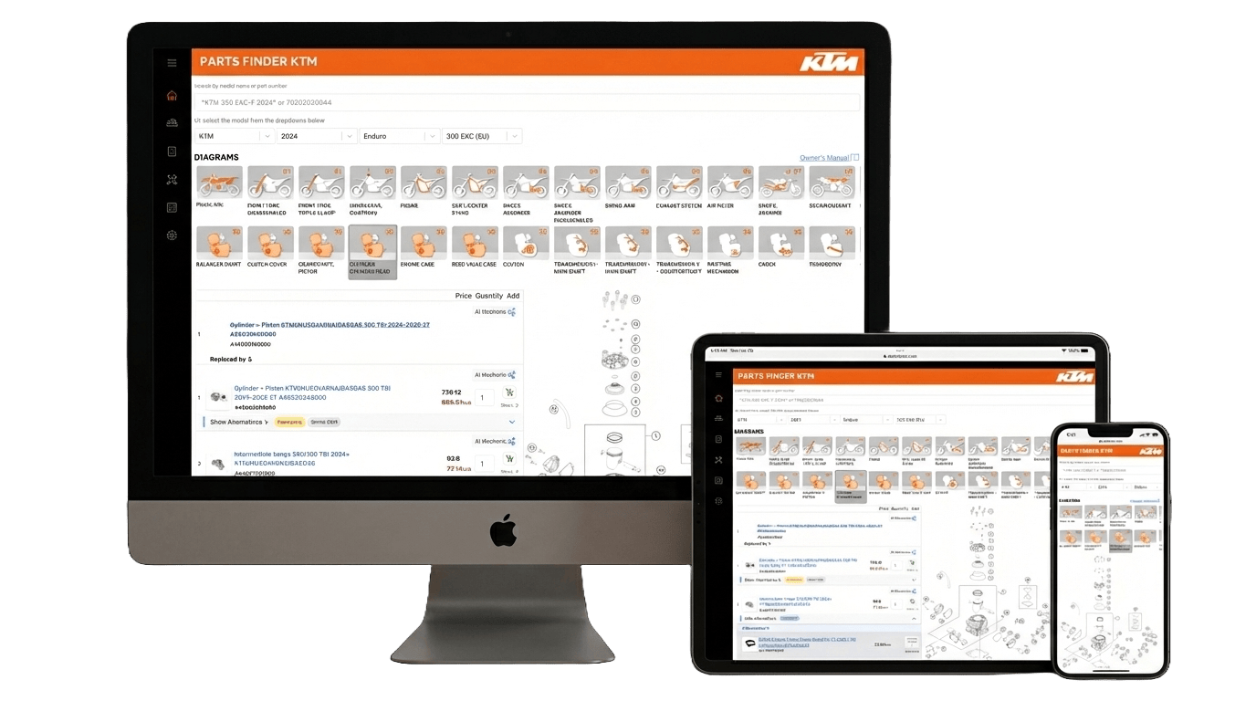Unlock the power of our cutting-edge Parts Finder software! Tailored for KTM dealers, it delivers intuitive fiche diagrams, AI-driven recommendations, real-time stock checks, and seamless ordering of OEM/aftermarket parts.