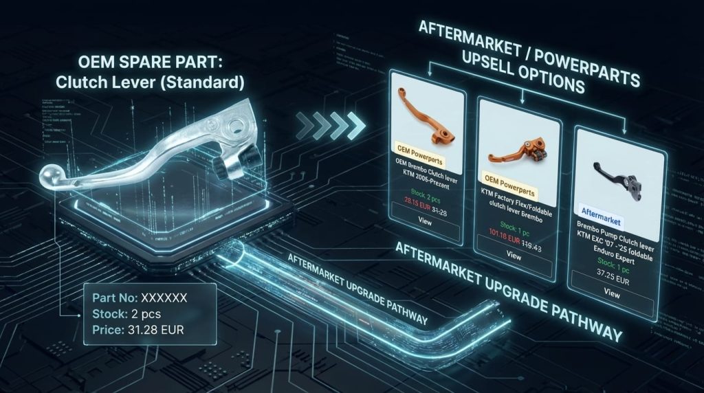 Integrate compatible aftermarket or PowerParts with any OEM spare parts, enabling users to effortlessly discover suitable alternatives, even if they are not OEM components.